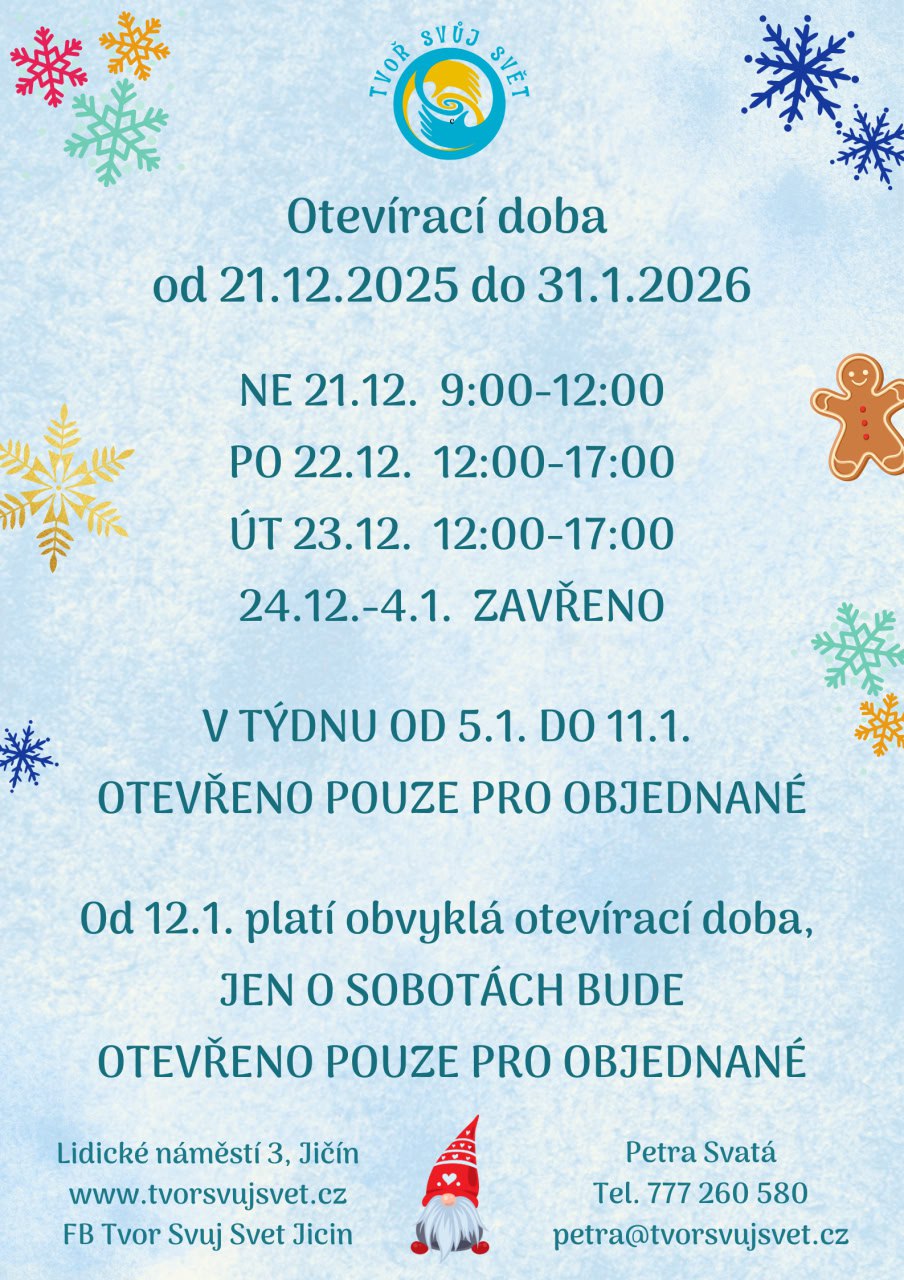 Od ledna 2025 došlo ke změně otevírací doby - pondělí a úterý dopoledne je vyhrazeno skupinám objednaným do tvůrčí dílny.