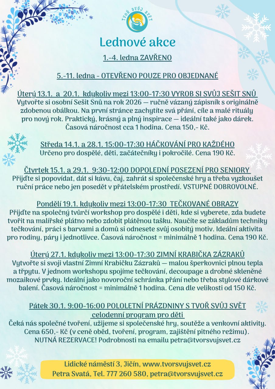 V týdnu od 5.1. do 11.1.2026 otevřeno POUZE PRO OBJEDNANÉ.